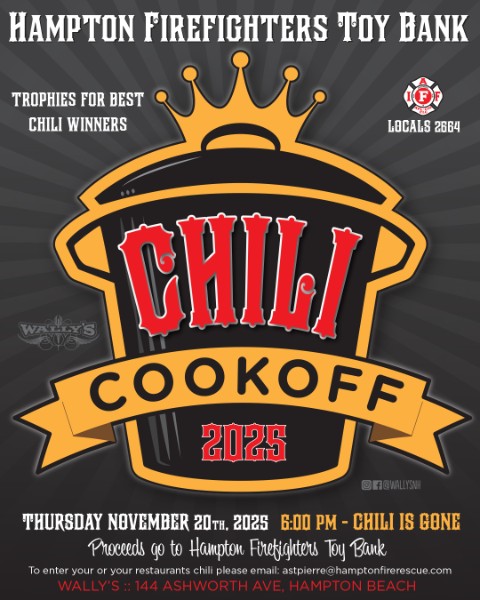 Events » Chili Cookoff Thursday, Nov 20 2025 - Venue Wally's Hampton, New Hampshire Event Details Artists/Info Map Images Artists and Info Map View Larger Map Images Claim