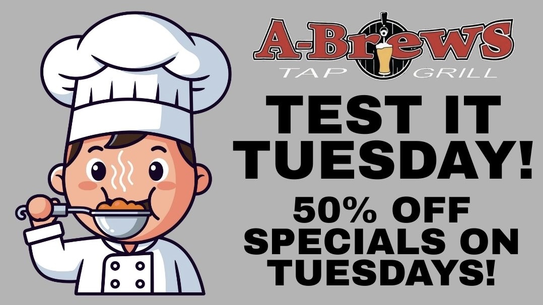 Introducing Test It Tuesday at A-Brews Tap & Grill — where our weekly food specials are 50% OFF every Tuesday.